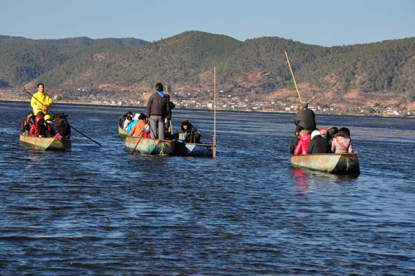 藍藍的天,潔白的云朵,幽靜的古城、清澈的溪流,新鮮純凈的空氣,多么理想的人居環(huán)境,這就是大家對麗江的初次印象!2012年12月15日上午9點,在周總的帶領(lǐng)下大部隊懷著愉悅的心情踏上了前往拉市海途中,經(jīng)過半個小時路程,到達青山映綠水,綠水照青山的拉市海,茶馬古道。