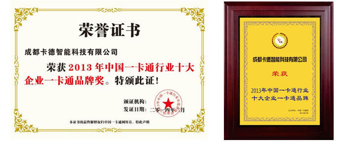 ?"2013中國一卡通行業(yè)十大企業(yè)一卡通品牌"證書及獎牌